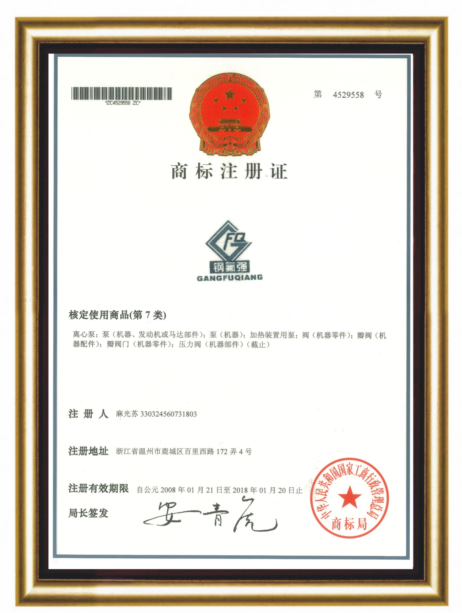 商標注冊證 全國產品和服務質量誠信示范企業